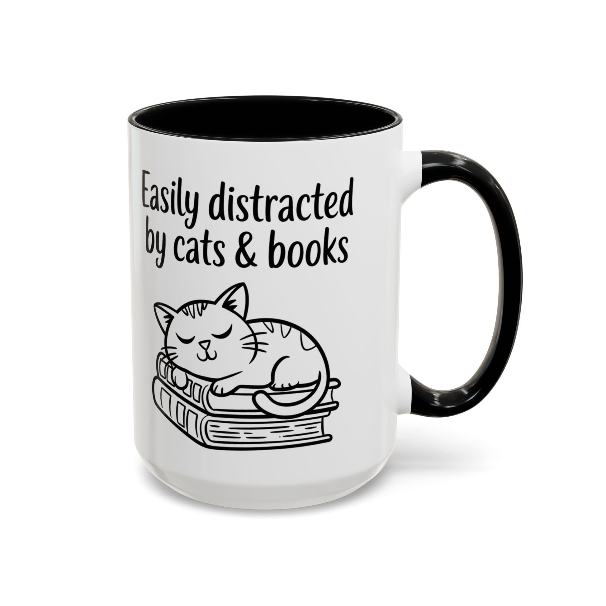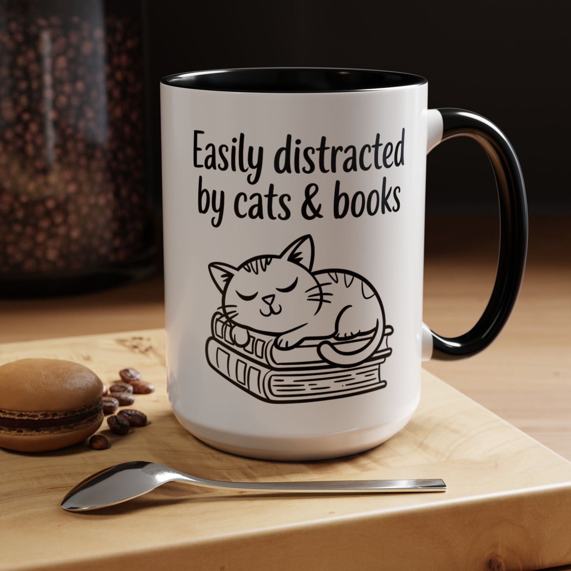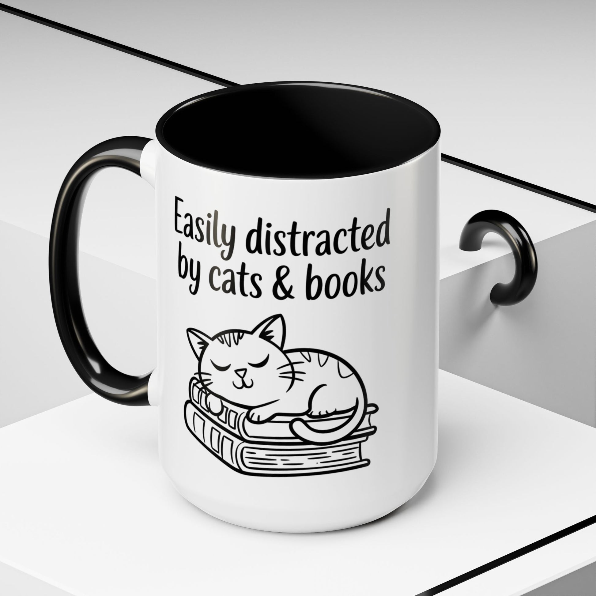 Easily Distracted By Cats And Books 15oz Coffee Mug, Book Lover Gift, Funny Cat Mug, Cat Lover Mug, Cat Lover Gift, Cats and Books